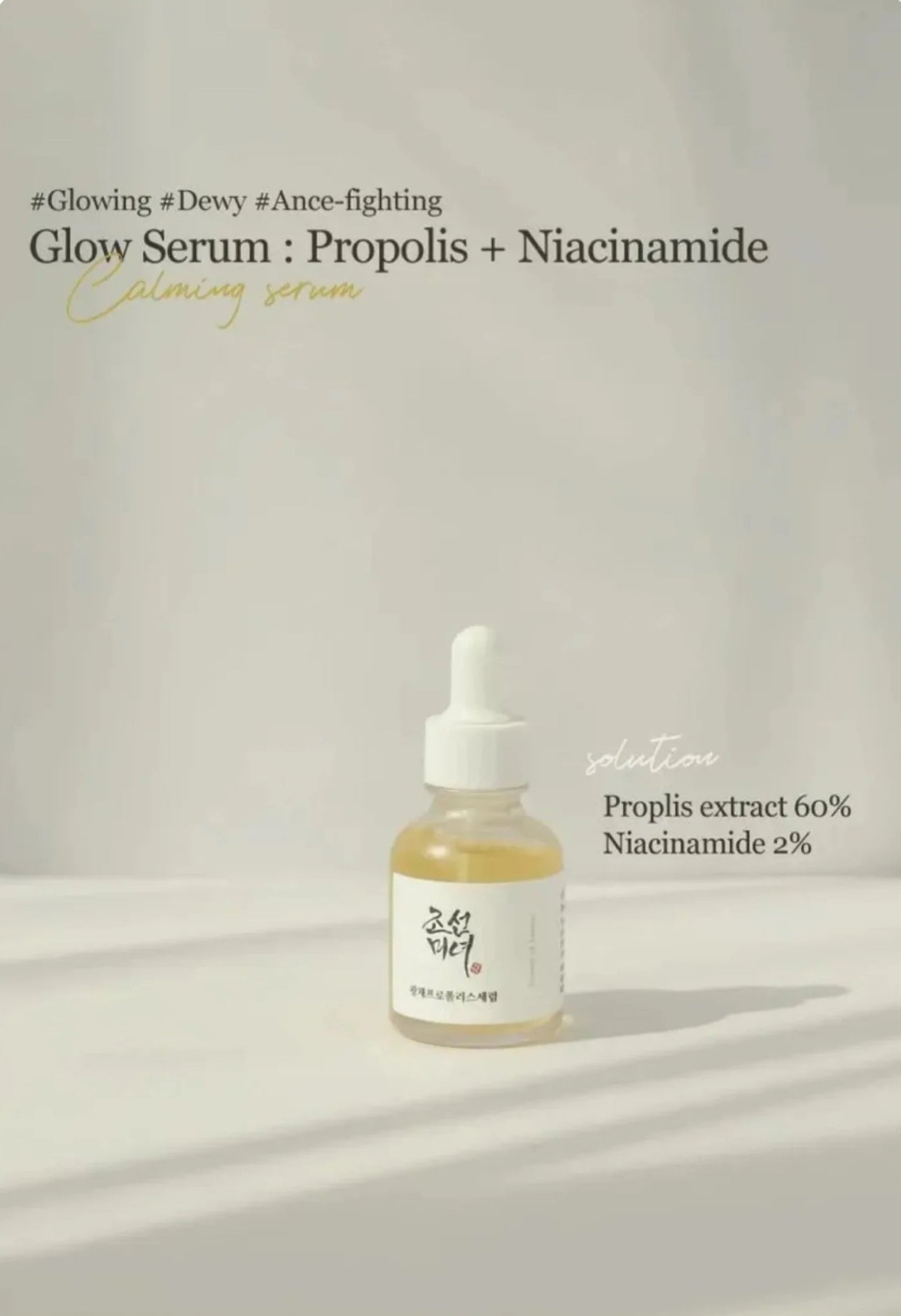 Glow Serum is enriched with 60% propolis extract and 2% niacinamide.