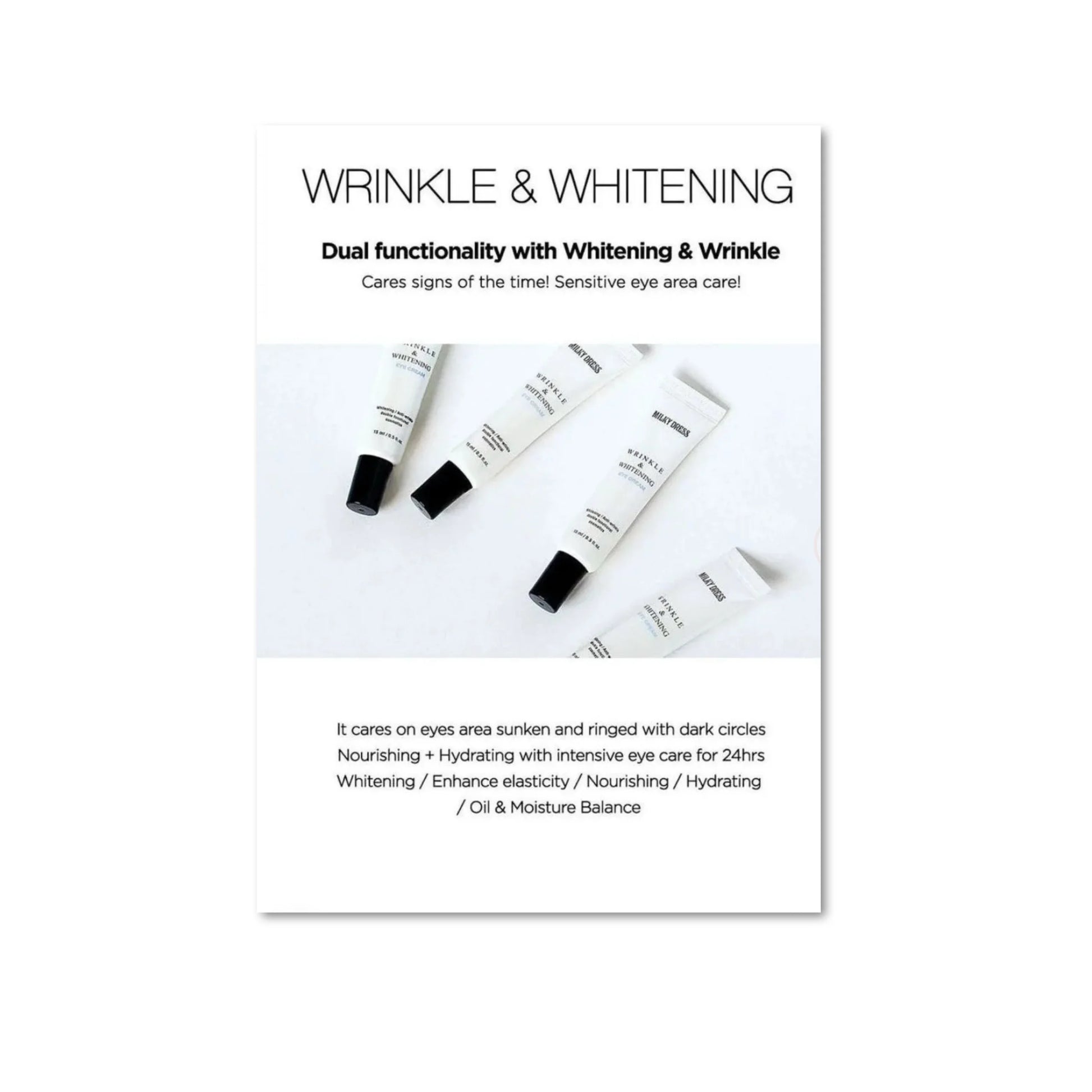 MILKY DRESS Wrinkle & Whitening Eye Cream is a refreshing gel-type eye cream that improves dark and dull under eyes and wrinkles, at the same time keeping eyes moisturized and vitalized. In addition, it also intensively take care by nourishing and hydrating weak and easily drying eyes for 24 hours for brighter and radiant eyes.